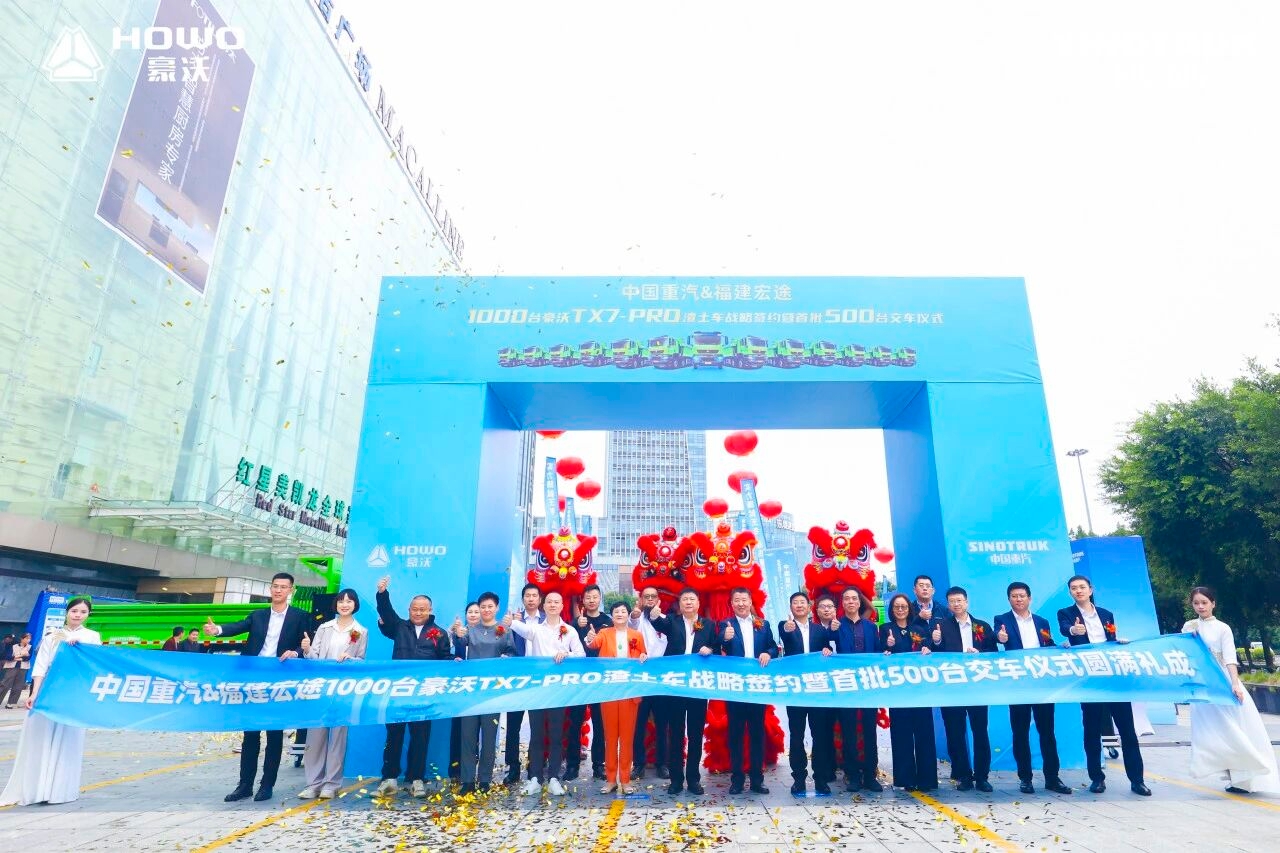 ??八閩福地,山海和鳴。10月28日,中國重汽與福建宏途1000臺豪沃TX7-PRO渣土車戰(zhàn)略簽約暨首批500臺交車儀式在福建福州圓滿舉行。本次合作秉持“合規(guī)、智能、高效”的核心理念,以高端裝備的可靠品質(zhì)與卓越性能,為福州城市建設(shè)與運(yùn)力升級注入強(qiáng)勁動能。