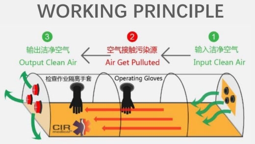 Système de pression négative Le plafond de la cabine médicale est équipé dun système de pression négative formant un flux dair à pression négative afin de garantir que lair expiré du patient ne circule pas dans la cabine médicale.