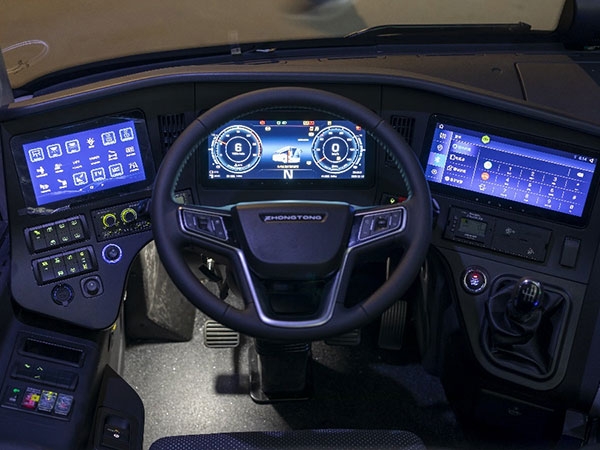 A la derecha, la pantalla de control central está integrada con funciones que incluyen navegación, monitoreo, control por voz, interconexión de móviles y autobús turístico, etc.