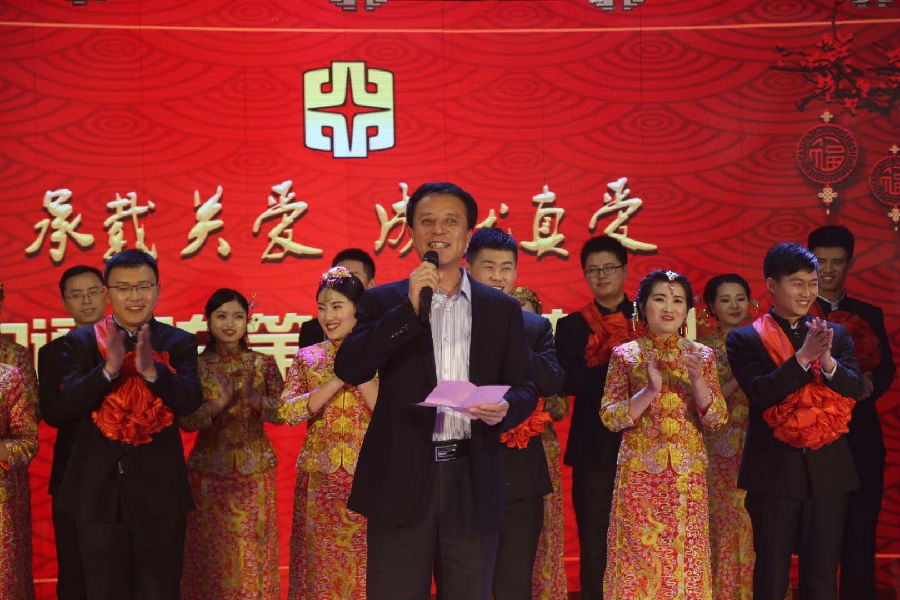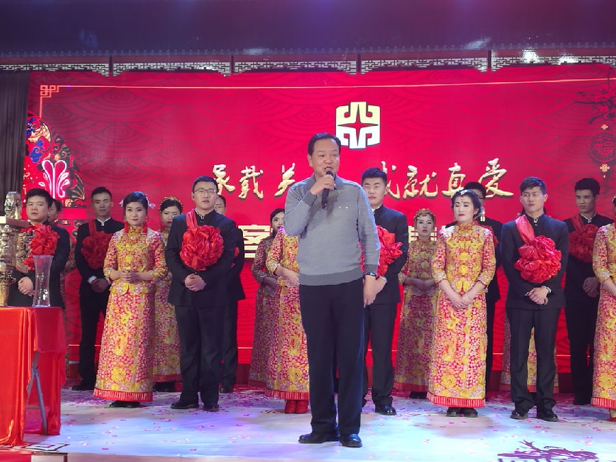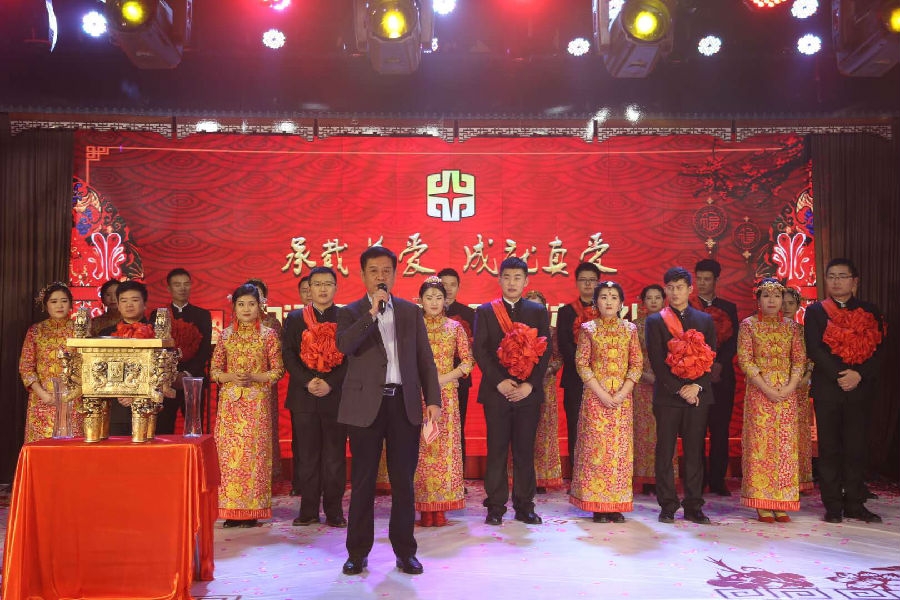 “新中式”禮儀,去傳統(tǒng)之糟粕,皆現(xiàn)代文明精華,引入企業(yè)文化理念?;槎Y儀式在現(xiàn)代震撼的燈光秀和傳統(tǒng)熱鬧的舞獅表演拉開序幕,11對(duì)新人陸續(xù)登臺(tái),敬天祈福,感恩答謝,公司總經(jīng)理孫慶民先生為新人證婚、董事長李樹朋先生為新人主婚、嘉賓山東省交通廳高洪濤廳長也給新人帶來美好的新婚祝福。