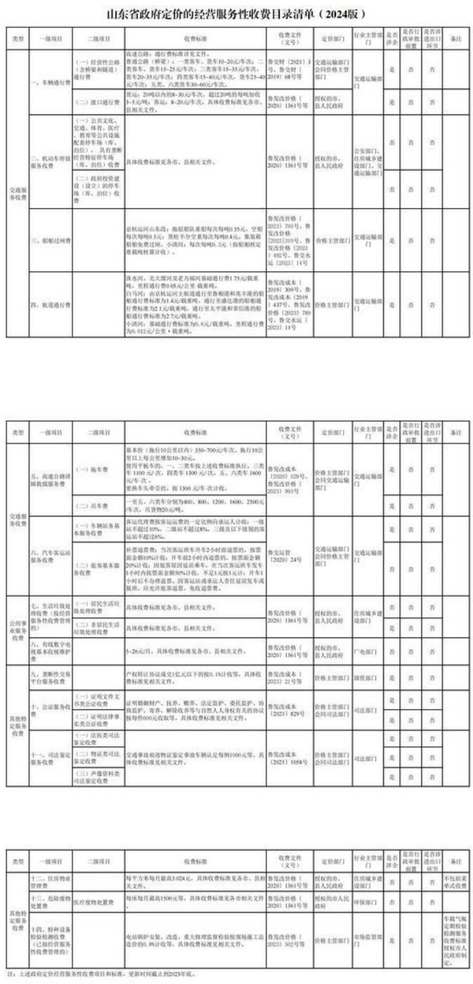 日前,2024版山東省政府定價的經(jīng)營服務(wù)性收費目錄清單公布,包括交通服務(wù)收費、公用事業(yè)服務(wù)收費、其他特定服務(wù)收費共三大類14個收費項目。